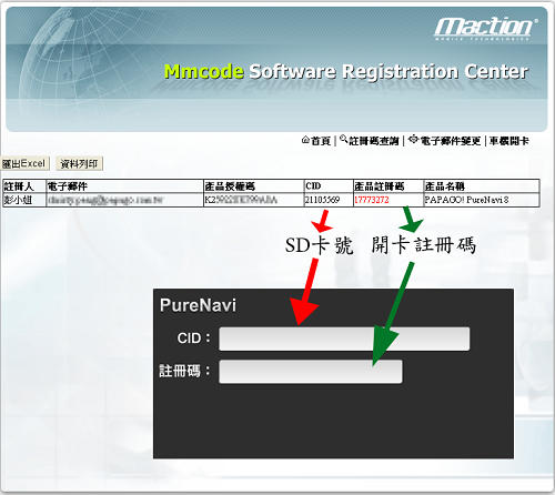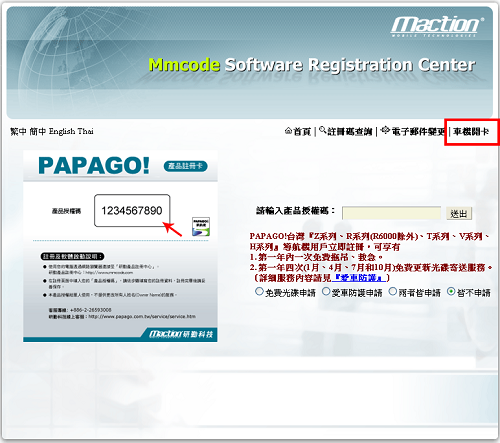 得到註冊碼 ->請將對應的號碼輸入車機上